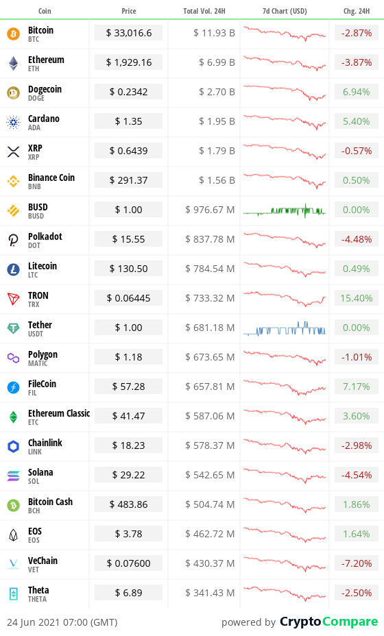 The Bitcoin price was actually pretty stable yesterday as it goes, continuing to trade in the range between $30-40k where it’s spent the better part of the last two months. It’s currently down around three per cent over the last 24 hours, changing hands for around $33k. The Ethereum price too continues to hover around the same $2,000 level as yesterday, also down three per cent over the last day.