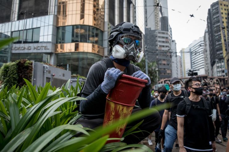 Today protesters dressed in black shielded themselves against tear gas behind the movement’s now iconic umbrellas.