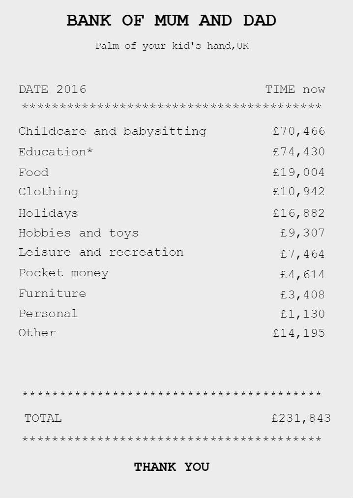 By the time the kids reach the age of 21, their parents have forked out £231,843 – more than it costs to buy a home in Britain, on average.