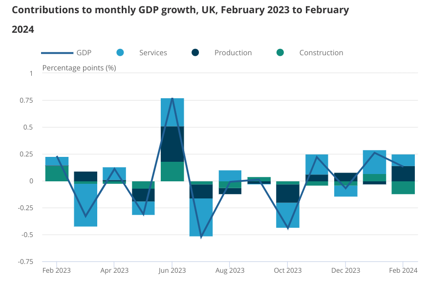 Production, which includes manufacturing, recorded the fastest increase, growing 1.1 per cent in February. The expansion was widespread, with only mining and quarrying the only subsectors to see a downturn.
