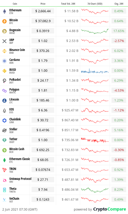 The big news today is Dogecoin’s listing on Coinbase Pro, which has sent the meme-coin up 20 per cent in the last day. It’s currently trading at just below $0.40, with Elon Musk subjecting the world to an onslaught of bullish tweets to accompany the rise. It was briefly the fourth largest cryptocurrency by market cap last month. Can it flip Cardano and Binance Coin to repeat the feat?