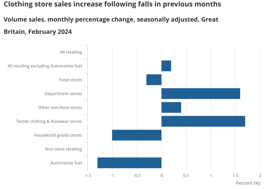 Non-food sales were up 0.7 per cent on the month. Heather Bovill, senior statistician at the ONS, noted that this was largely due to strong growth in clothing sales thanks to new season’s collections”.