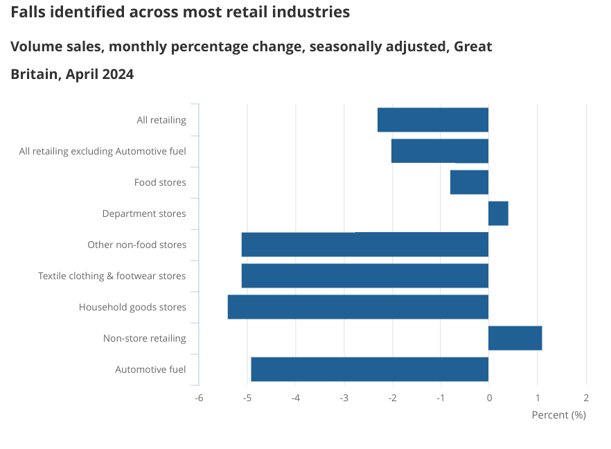 According to the Office for National Statistics (ONS), retail sales fell 2.3 per cent in April, a much worse fall than predicted by economists.