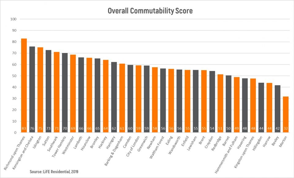 Unsurprisingly Kensington & Chelsea has the shortest commute at 26 minutes, and this contributes to it coming second in the overall ranking. The average London commute lasts a fairly reasonable 39 minutes and costs £96 per month.