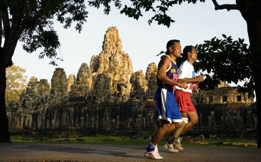 IT IS is not yet eight in the morning but already the heat and humidity is cloying as I run down the long, red-earth road that skirts the south side of the Angkor Wat temple in Siem Reap, Cambodia. The tall army of trees flanking each side of the path seems to be closing in on me and, despite having only just passed a water station, I am already craving another bottle to pour over my head.
