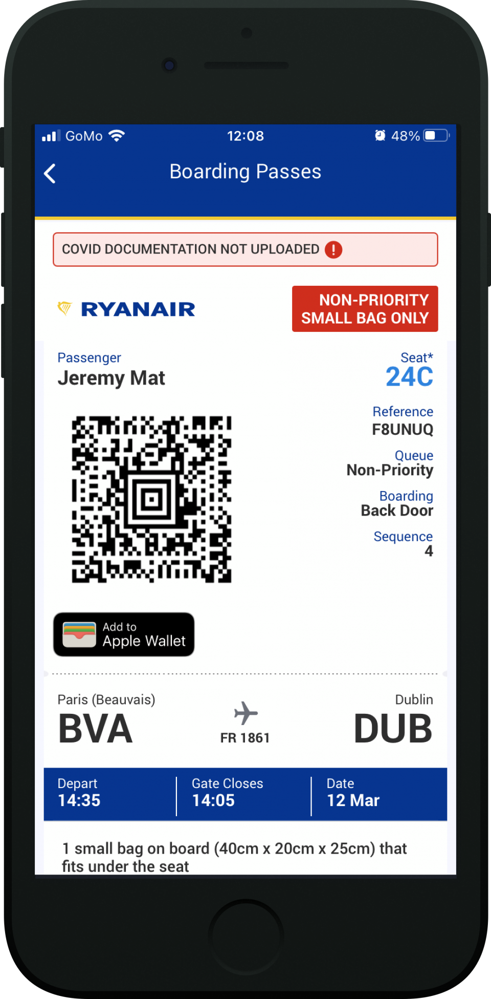 “Ryanair’s new C-19 Travel Wallet ensures passengers have all their Covid-19 travel documents saved and secure in one place to present at airports on their next getaway.”