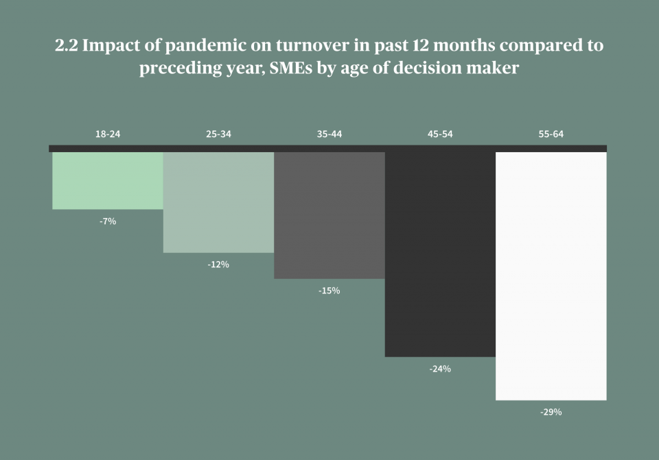 In 2020 companies run by decision makers who were aged between 55 and 64 saw an average reduction in turnover of 29 per cent, this fell to 12 per cent for 25 to 34 year olds and 7 per cent for businesses run by 18 to 24 year olds.