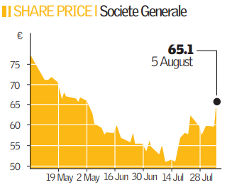 The Paris-based bank, which is still coming to terms with the rogue trading scandal that caused a €4.9bn loss, saw net profits fall to €664m (£525m) from €1.74bn last year. But analysts had previously forecast a smaller profit figure, and shares climbed 9.4 per cent to €65.1 in Paris trading.