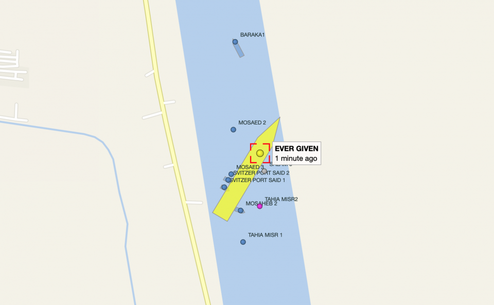 So far, dredgers have tried to clear silt around the massive ship. From the shore, at least one excavator dug into the canal’s sandy banks, suggesting the bow of the ship had ploughed into it.