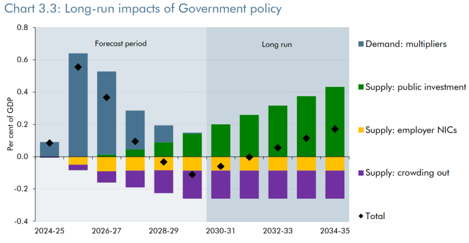 Hughes said that the net effect of the government’s policies would “turn positive in the early 2030s as the lagged impact of a larger public capital stock feeds through into potential output”.