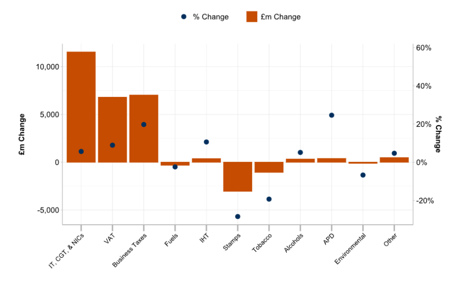 The boost was mainly driven by an increase in receipts from income tax, capital gains tax and national insurance contributions (£11.5bn), business taxes (£7.7bn), and VAT (£6.8bn).