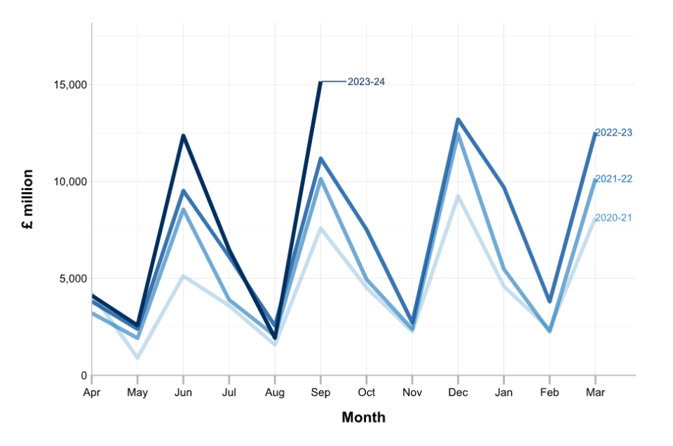 The total receipts between April and September came in at £43.3bn, up £7.7bn from last year.