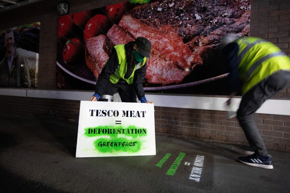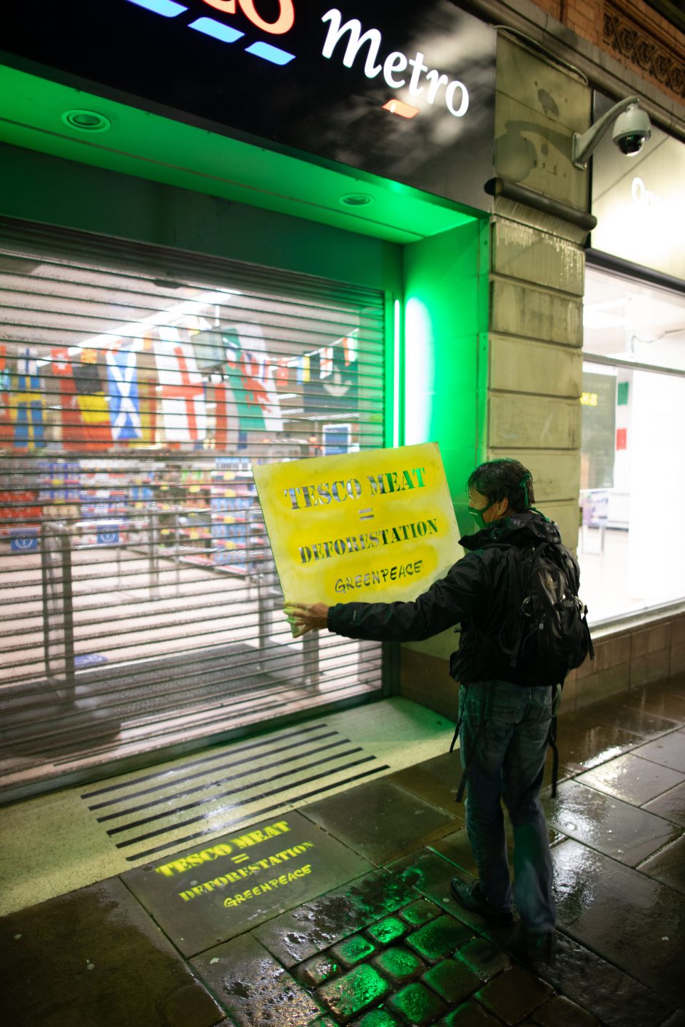 Overnight, more than 200 Tesco stores across the country awoke to chalk stencils that read ‘Tesco meat = deforestation’ in their entrances.