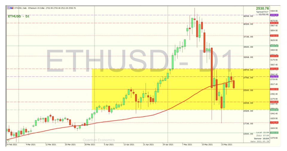 Where ETHUSD has been: After breaking above $1,000, ethereum had been rising steadily to hit a ceiling at $2,030, falling back to $1,500, and then testing $2,500. ETHUSD joined the craze for crypto assets in earnest rather late after breaking the resistance at $2,500 toward end-April. By this time, bitcoin had only just recovered from its latest major correction. ETHUSD surged past $4,000, tried to reach $4,500 but failed.