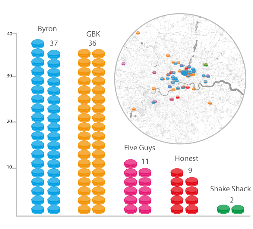 Whether there is enough room for relative newcomers to grow so much in an increasingly crowded marketplace remains to be seen. Honest Burger began opening its stores in 2011, at which point GBK and Byron had more than 20 restaurants each in London. Five Guys, which did not respond to our request for data, opened its first restaurant in 2013.