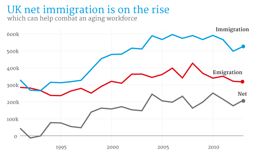 One way the ageing population could be combated is through immigration. Many people come to the UK to work or study, which boosts the supply of young workers if they stay to have families. Despite the government’s best efforts to curb it, net immigration has been rising.