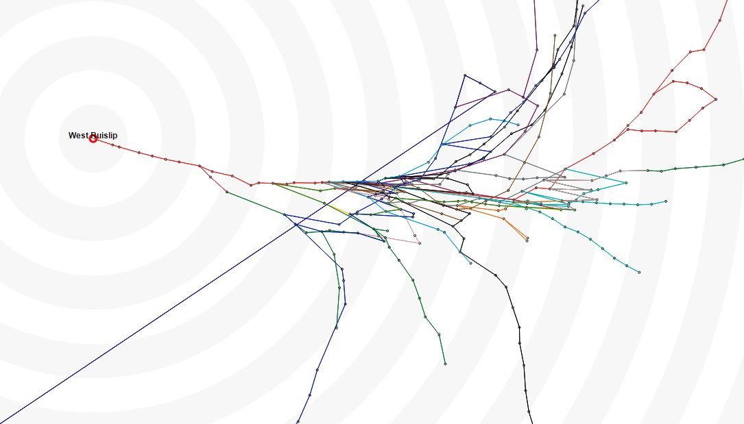 Commuters planning a journey from, say, West Ruislip, however, will discover a map that bears no resemblance to either geography or Beck’s map (just look at what happens to the Piccadilly line!).