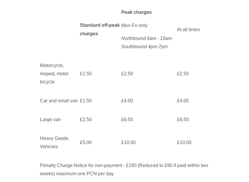 “To manage traffic during the busiest times, peak charges will apply. It is proposed that peak charges will be £1 more than standard off-peak charges for motorbikes and an extra £2.50 for cars and small vans, and will apply for four hours northbound in the morning (from 06:00 to 10:00) and three hours southbound in the evening (from 16:00 to 19:00), Monday to Friday.”