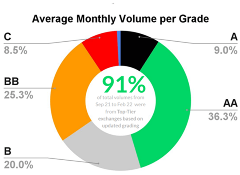 Top-Tier exchanges, it’s worth noting, are those ranked AA-B. Only four cryptocurrency exchanges – Coinbase, Gemini, Bitstamp, and Binance – have received an AA rating from the cryptoasset data provider, while 11 exchanges received an A rating, 27 received a BB rating, and 37 received a B rating. 80 crypto exchanges were ranked as Lowe-Tier.