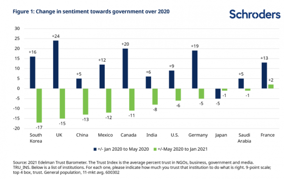 Between January and May 2020, trust in government rose in almost all countries: people all over the world put faith in their leaders as the global pandemic took hold.