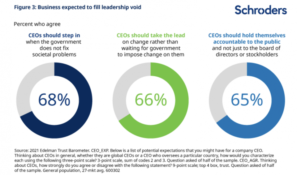 Another question reveals that 86% of respondents expect CEOs to address societal problems, including the pandemic.