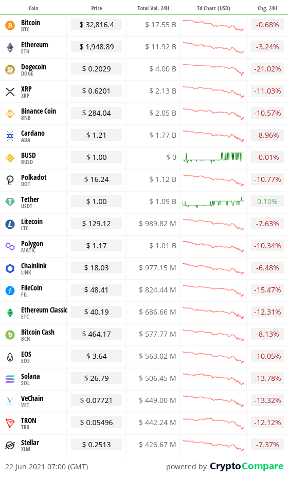 The crypto markets had a rollercoaster of a day yesterday, with Bitcoin briefly dipping below $30,000 for the first time since January before recovering sharply to around $34,000 at time of writing. The question continues to be whether we’ve hit bottom or if we will see another push towards $40,000 this week?