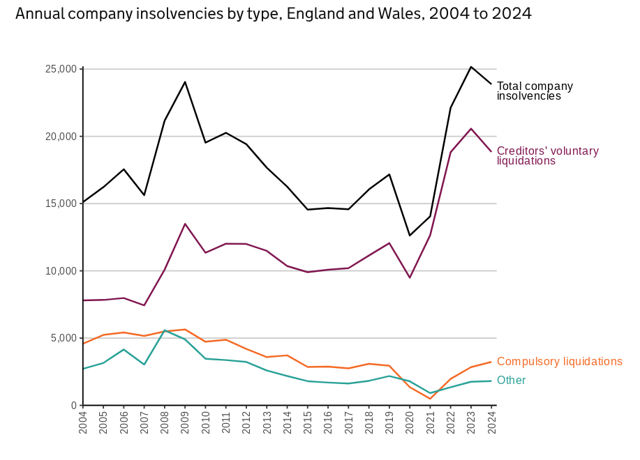 Figures released from the Insolvency Service showed that there were 3,320 compulsory liquidations in 2024, the highest number for 10 years and a 14 per cent increase on the year before.
