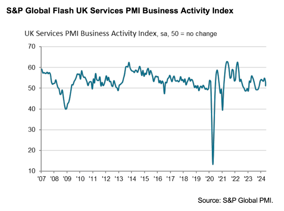 The latest S&P Global Flash UK PMI showed that output had dropped to the lowest level since November, to 51.7 in June, down from 53.0, in May.