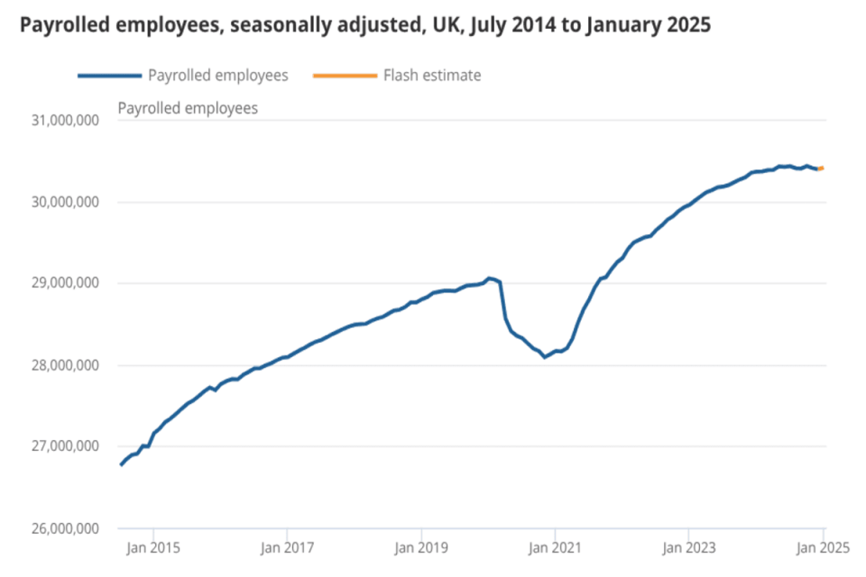Early estimates of payrolled employment in January were in positive territory for the first time since last August, the figures showed, with growth of 21,000.