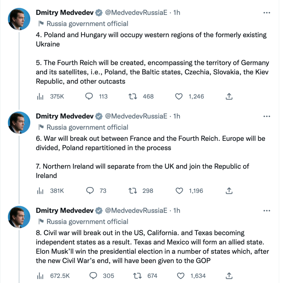The ex Kremlin leader made a series of bold predictions on Twitter which also included Northern Ireland joining the Republic, and a civil war breaking out, with Elon Musk becoming President.