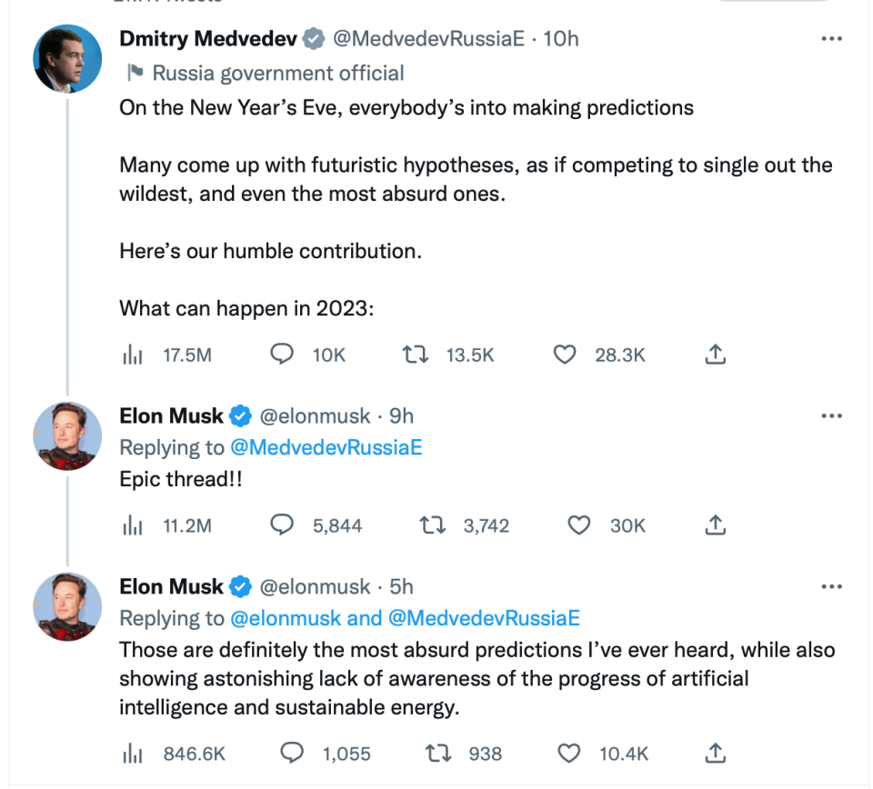 Dmitry Medvedev shared his 10 outlandish predictions for the next 12 months on Twitter and was widely mocked.
