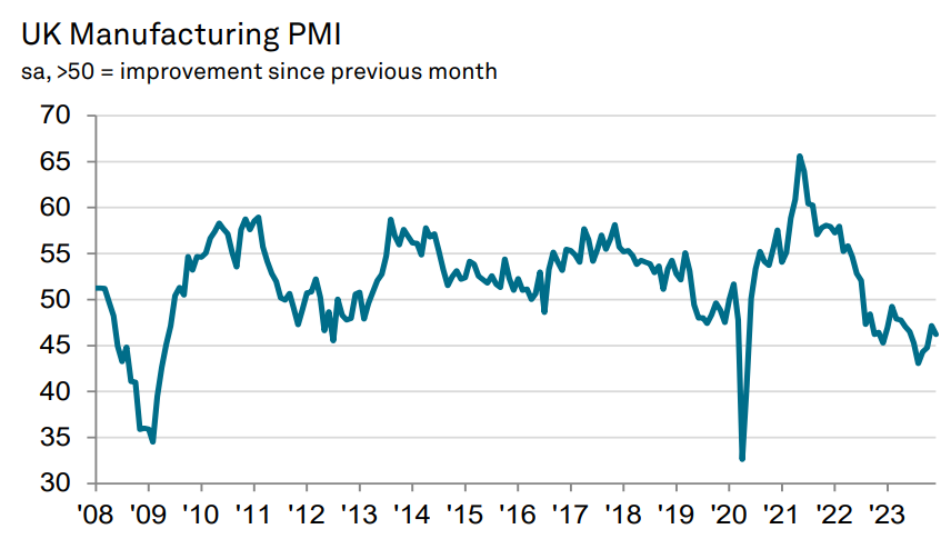 S&P’s global UK manufacturing Purchasing Managers’ Index (PMI) slipped back to 46.2 in December, lower than the 46.4 recorded in the ‘flash’ estimate in mid-December.