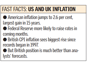Inflation trends differed markedly on either side of the Atlantic yesterday, with the American producer prices (PPI) confounding analysts with their biggest gain in 15 years, but Britain got off lightly with a consumer price index (CPI) level of just 2.5 per cent.