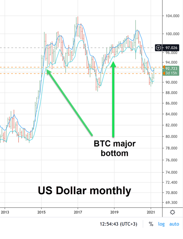 1) Strong dollar. Since 2013, a strong dollar has put pressure on Bitcoin and cryptocurrencies as investors are more likely to buy the dollar thus reducing buying pressure on cryptocurrencies. Major price bottoms in Bitcoin came shortly after a big spike in the strength of the US dollar.