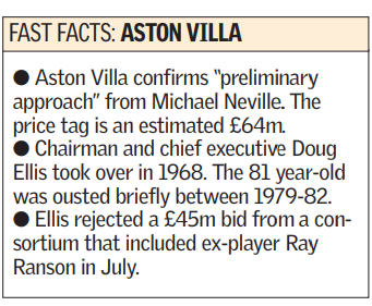 Ellis has said “they will have to carry me out of this club feet first in a wooden box” but has been suffering ill health. The 81-year-old is thought to have been tempted by an advisory role, with diehard Villa fan Neville tipped as executive chairman.