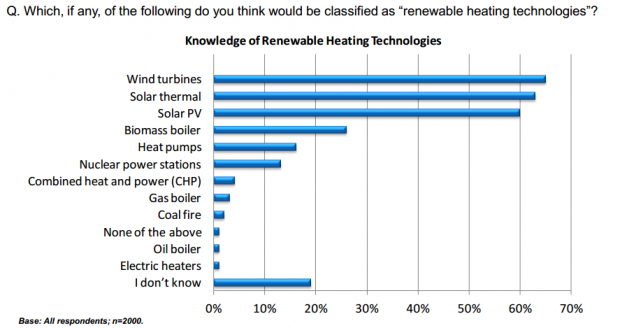 Few were able to identify the majority of renewable heating technologies, either, with less than 70 per cent being able to identify wind turbines or solar power as sources of renewable energy.