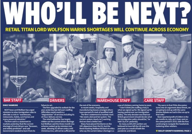 Many have placed the blame on the UK’s departure from the EU, but the Brexit-backing Wolfson hit back at critics who say the current labour shortage is a case of the chickens coming home to roost.