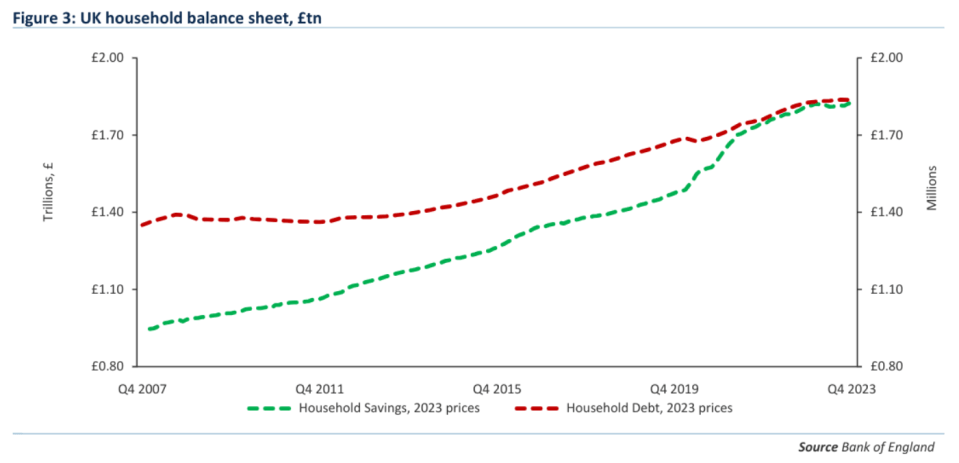 Cash and consumer debt now equal around £1.8trn, unlike in much of the previous decade, when debt outweighed savings.