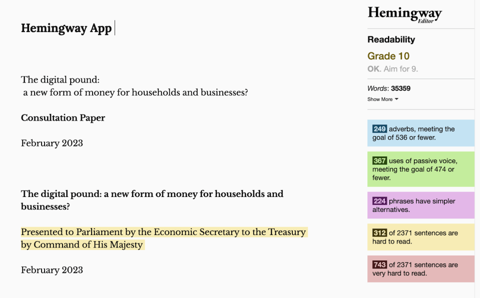 The CBDC consultation paper consists of a total of 2,371 sentences. A thorough analysis revealed that out of these sentences, 312 were categorised as hard to read, while a staggering 743 were labelled as very hard to read. These challenging sentences account for a significant 45% of the entire document.