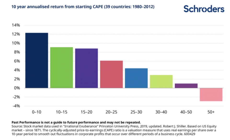 We can see that the cheapest stocks – those with a starting price-to-earnings ratio of 0-10x – have typically produce the best returns over the subsequent ten years. The most expensive – those with a P/E ratio of 50+ – have delivered the worst.