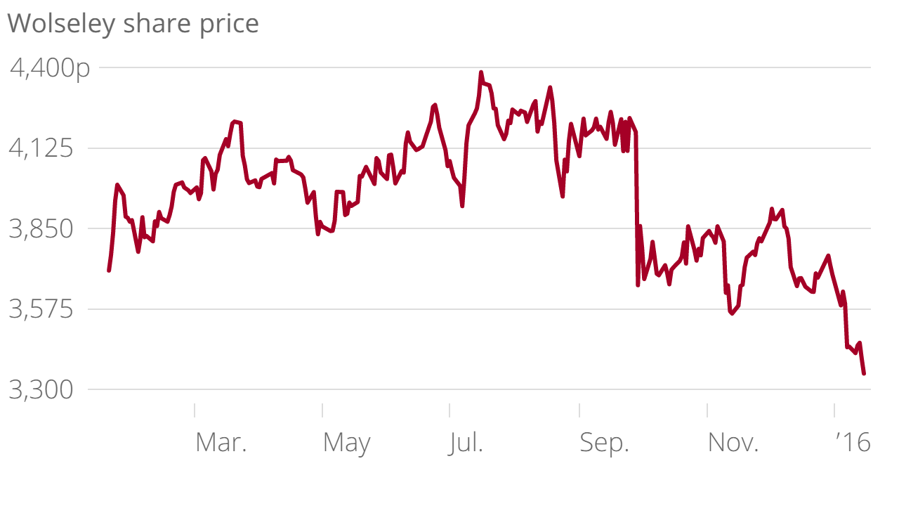 Wolseley shares have been plunging since the homebuilder warned of sinking revenue growth in September, feeling the impact of a cooling UK housing market. It said it expected to generate like-for-like revenue growth of about four per cent in the six months to January 2016, down from a six-month forecast of six per cent it gave in June.