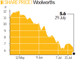 Woolworths, which runs over 800 shops selling items from garden furniture to children’s clothes and toys, said like-for-like sales fell 6.7 per cent in the six weeks to 26 July. Gross maralso fell.
