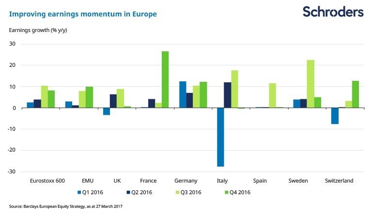 However, recent earnings seasons have painted a more positive picture. The chart below shows that corporate earnings in Europe picked up significantly over the course of 2016.