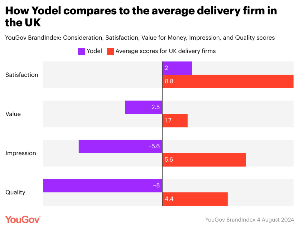 This metric sits at -8.0, compared to a combined average of 4.4 for other parcel delivery services in the UK: a gulf of 12.4 points. Whether it’s the aforementioned adverse headlines colouring public opinion, or negative first-hand experiences, turning these opinions around may alleviate some of Yodel’s current image problems.